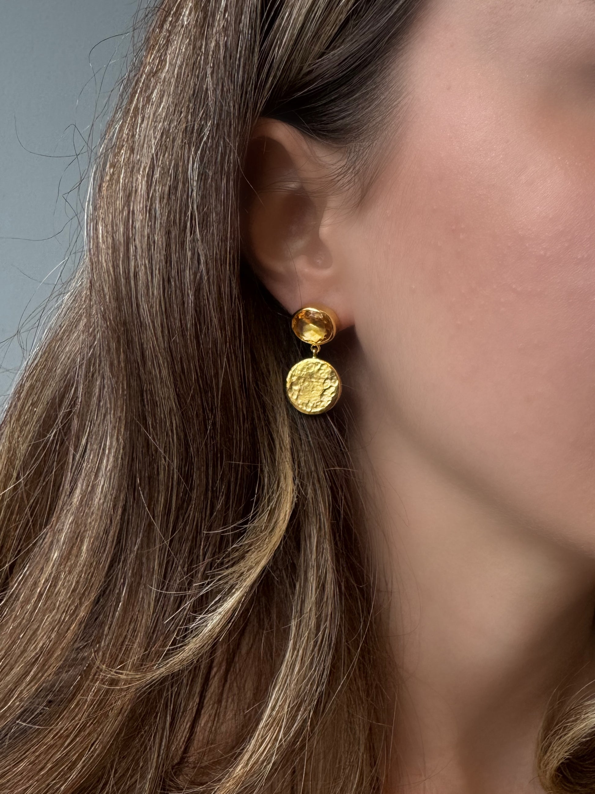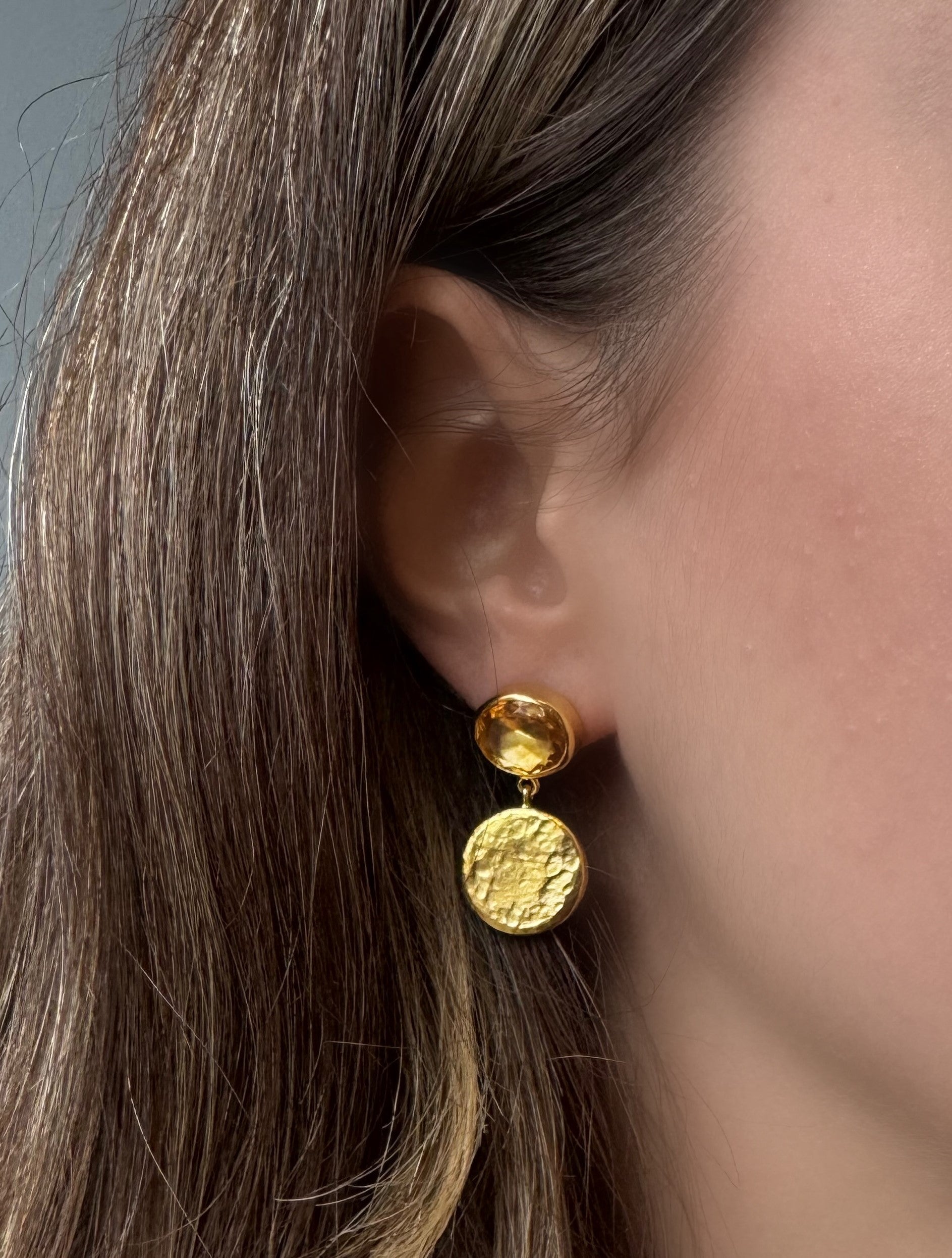 Has astar gümüşe dövme tekniğiyle doku verilmiş astardan el işi olarak üretilen küpemizde 9x11 mm oval faset kesimli DOĞAL Sitrin taş kullanıldı, Görünümüne rağmen hafif olan sallantılı küpemiz 0,50 mikron 24 ayar altın renk ile kaplandı, kimyasallardan uzak tutarsanız uzun süre ilk günkü gibi kullanabilirsiniz. Mağazamızda satışa sunduğumuz küpemiz kendi Tasarımımız ve üretimimizdir. DOĞAL olarak belirttiğimiz taşlı takılarımızda kullanılan taşlarımız için GARANTİ vermek isteriz. Sentetik Zirkon grubu taşlar ürünlerimizde kullanılırsa bu ürün açıklamalarında belirtilir.