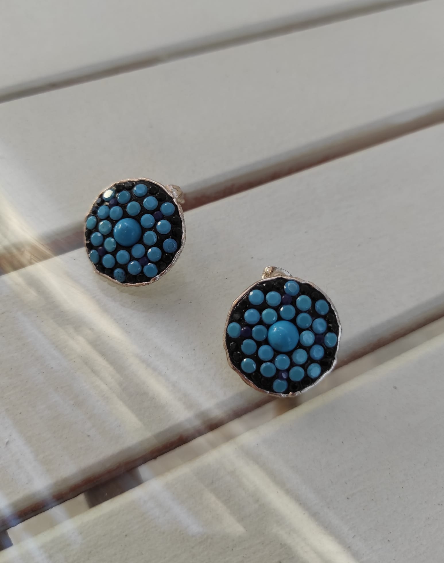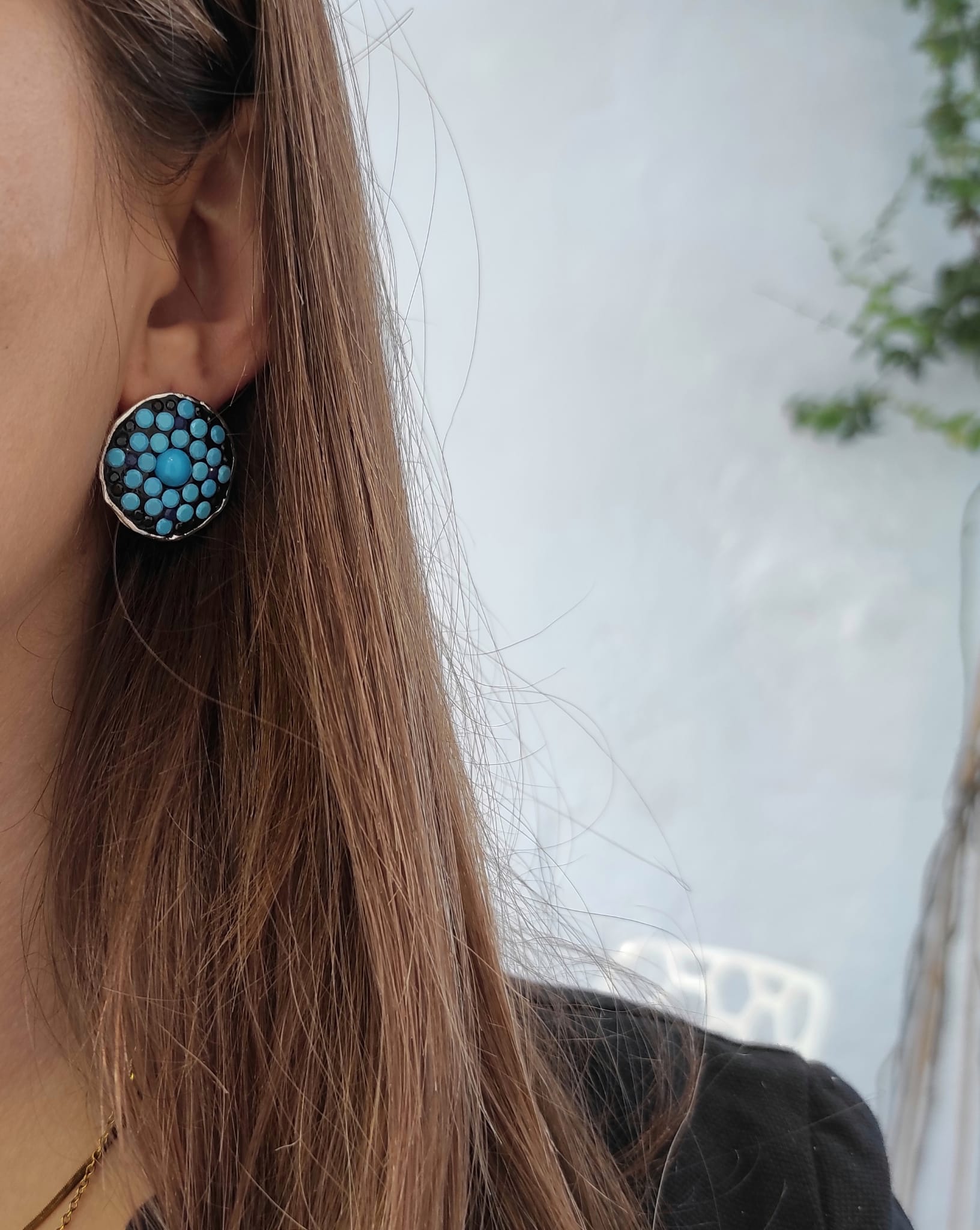 Mavi Firuze EtnikModern Küpe, eski zamanlardan beri tibet ve türkmen takılarında kullanılan reçine üzerine taş işlenen ''teknik'' modern bir yorumla kullanılmış. Doğal firuze taşına kaliteli bir alternatif olan firuze renginde sentetik taştan boncuklar kullanılmış. Bronz üzerine gümüş kaplama, ayrıca oksitlenmemesi için özel bir koruma ile kaplı. Kullanım tavsiyelerine uyarsanız uzun yıllar ilk günkü gibi kullanabilirsiniz.