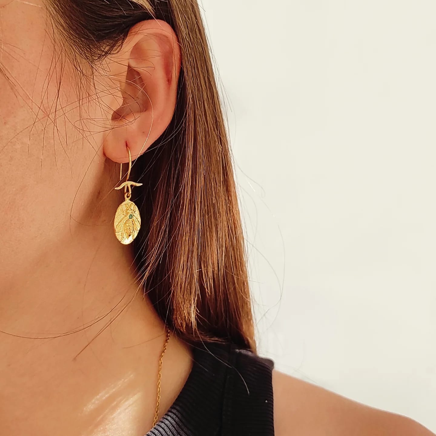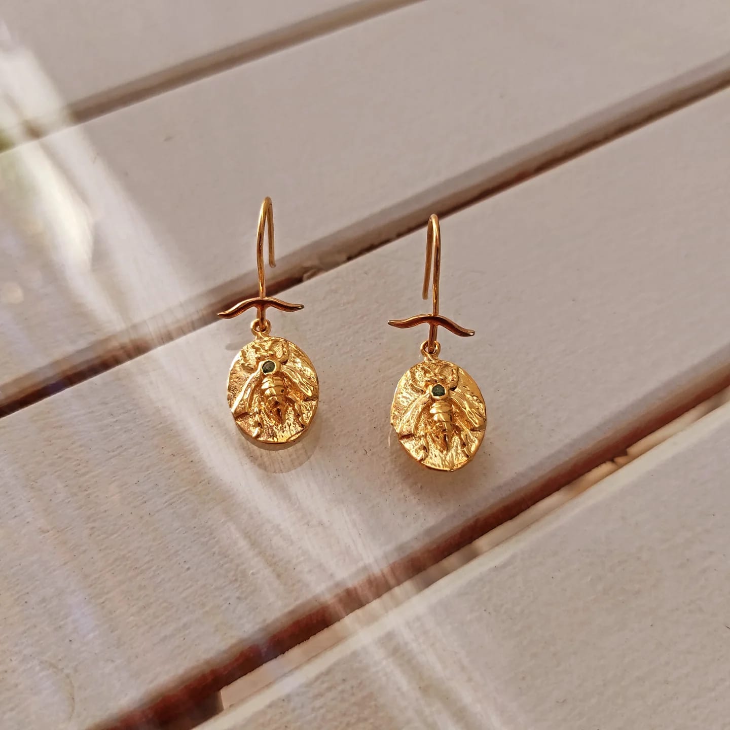 Vintage Zümrüt Taşlı Sinek Figürlü Altın Kaplama Küpe