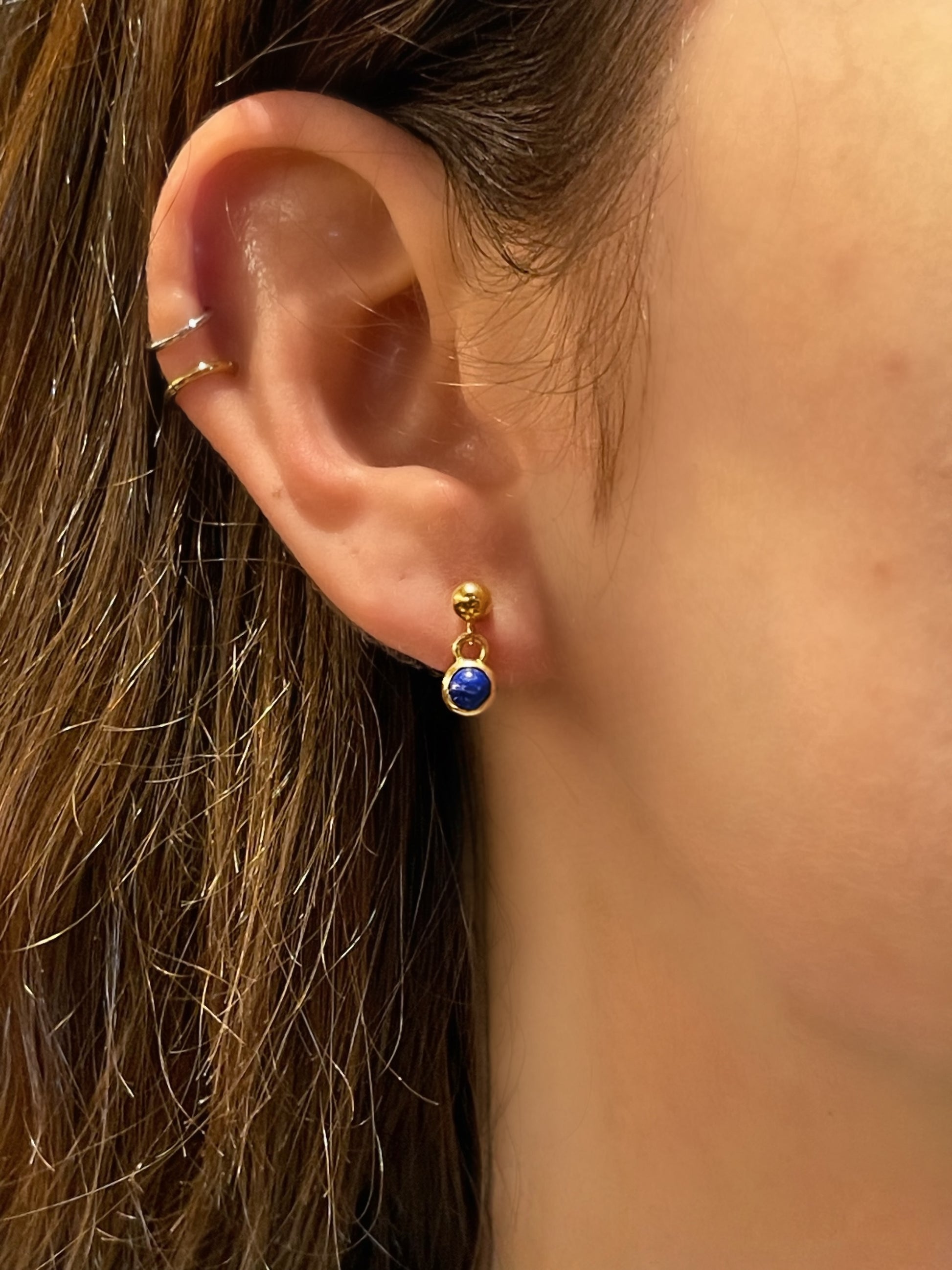925 ayar Gümüş üzeri 0,50 mikron altın kaplama 4 mm yuvarlak kapşon kesimli DOĞAL Lapis Lazuli taşlı mini sallantılı küpe, şık küpemizi kimyasallardan uzak tutarsanız uzun süre ilk günkü gibi kullanabilirsiniz. Mağazamızda satışa sunduğumuz küpemiz kendi Tasarımımız ve üretimimizdir. DOĞAL olarak belirttiğimiz taşlı takılarımızda kullanılan taşlarımız için GARANTİ vermek isteriz. Sentetik Zirkon grubu taşlar ürünlerimizde kullanılırsa bu ürün açıklamalarında belirtilir.
