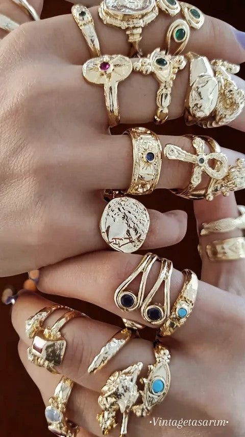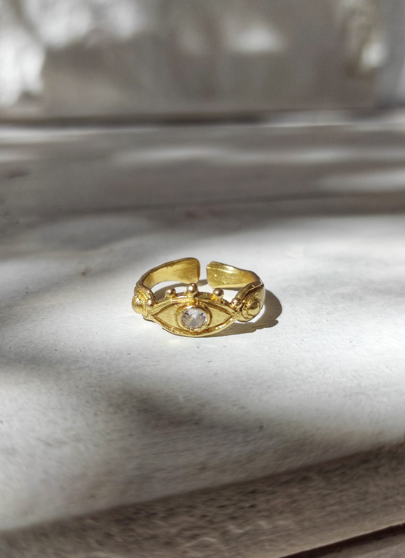 Pirinç ve Bronzun kendi renginde kullanıldığı, çok özel bir kaplama ile oksitlenmesini önlediğimiz ''VİNTAGE TYM'' koleksiyonumuzdan çok büyük ölçüler dışında her parmağa göre ayarlanabilir kollu Antik zaman takılarını andıran yüzüğümüz göz formunda yapılmış,Pırlanta taklidi yuvarlak faset kesim beyaz zirkon taş kullanılmış.