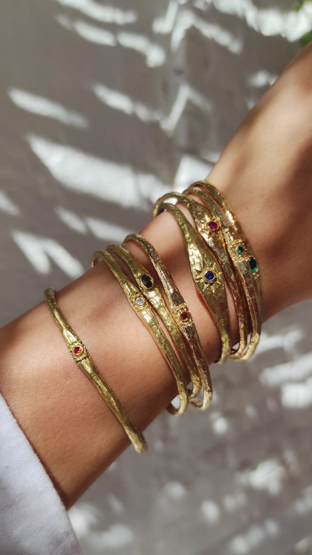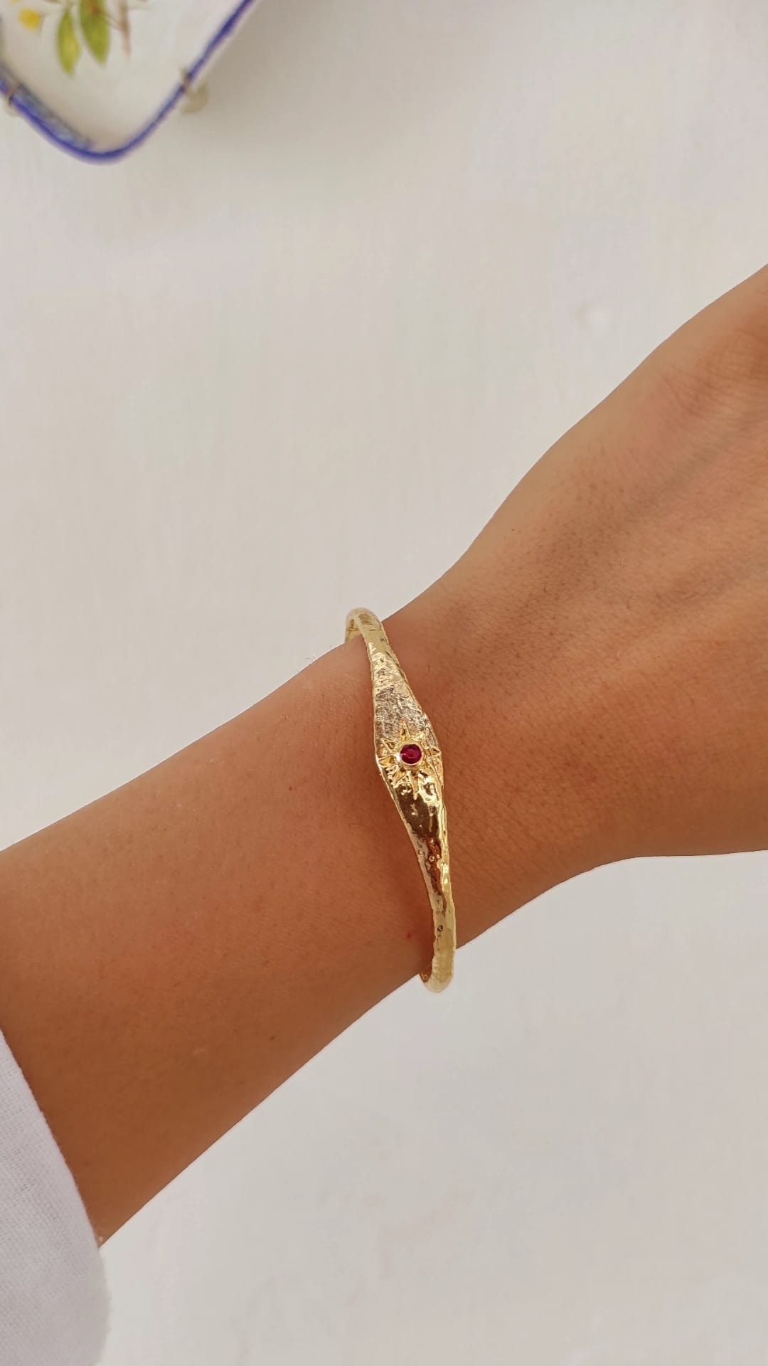 Pirinç ve Bronzun kendi renginde kullanıldığı, çok özel bir kaplama ile oksitlenmesini önlediğimiz ''VİNTAGE TYM'' koleksiyonumuzdan Güneş desenli özgün bir bilezik, dokulu ve el işi olması antik bir görüntü veriyor, Yakut taklidi kırmızı zirkon taş kullanıldı.