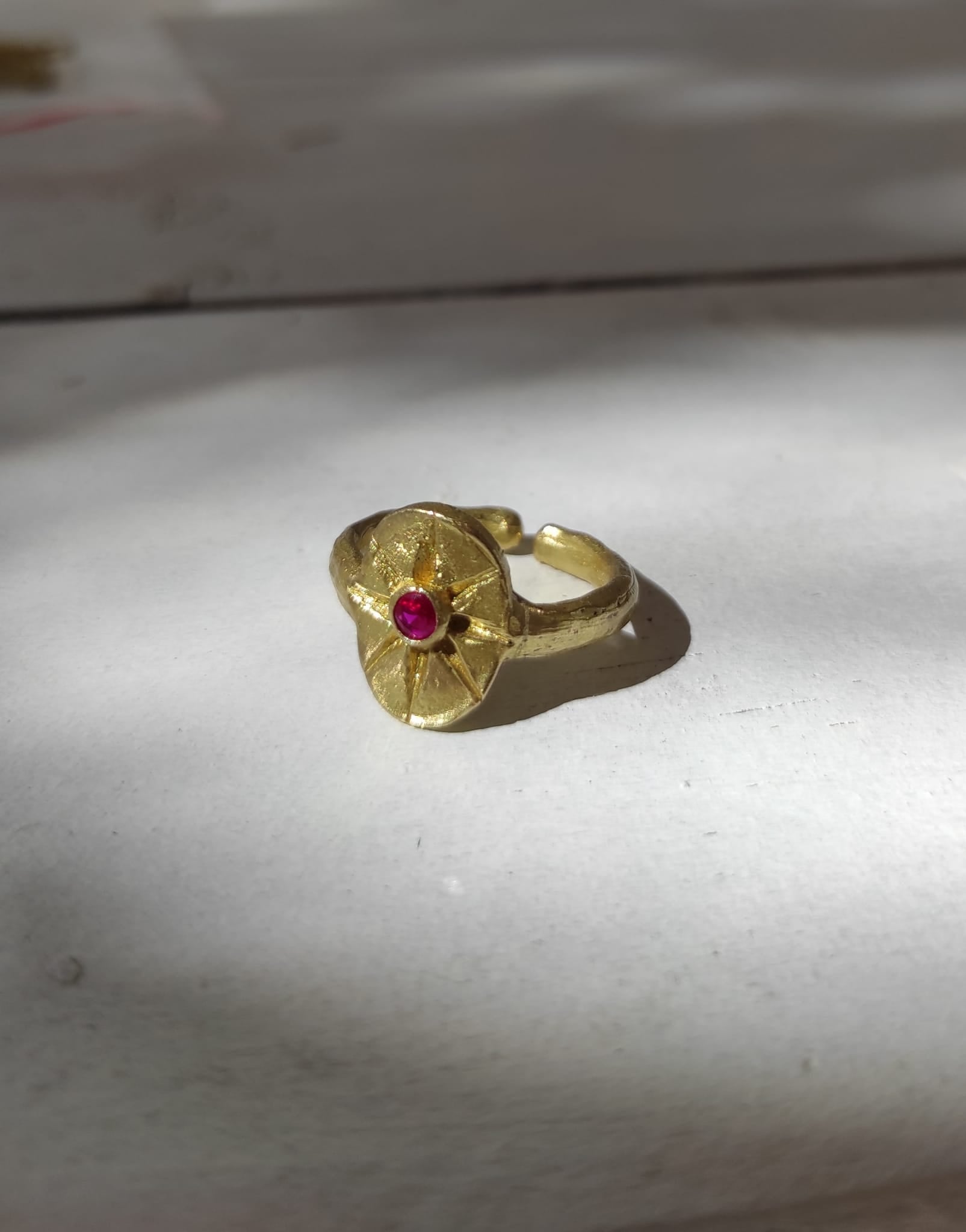 Pirinç ve Bronzun kendi renginde kullanıldığı, çok özel bir kaplama ile oksitlenmesini önlediğimiz ''VİNTAGE TYM'' koleksiyonumuzdan çok büyük ölçüler dışında her parmağa göre ayarlanabilir kollu Antik zaman formunda yüzüğümüze kuzey yıldızı deseni yapılmış,Yakut taklidi yuvarlak faset kesim zirkon taşlı yüzüğümüz, dokulu ve el işi olması tarihi bir yüzük görüntüsü veriyor.