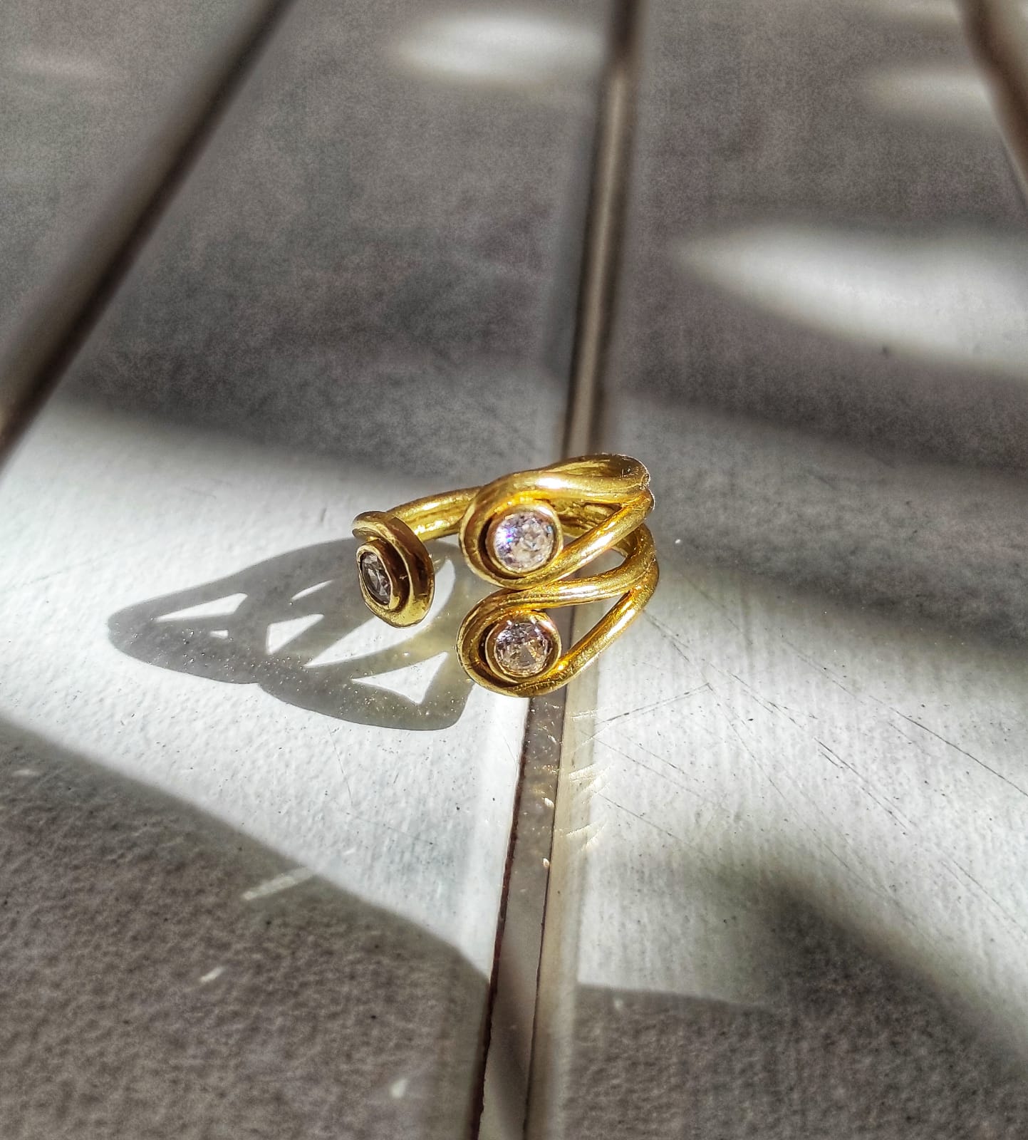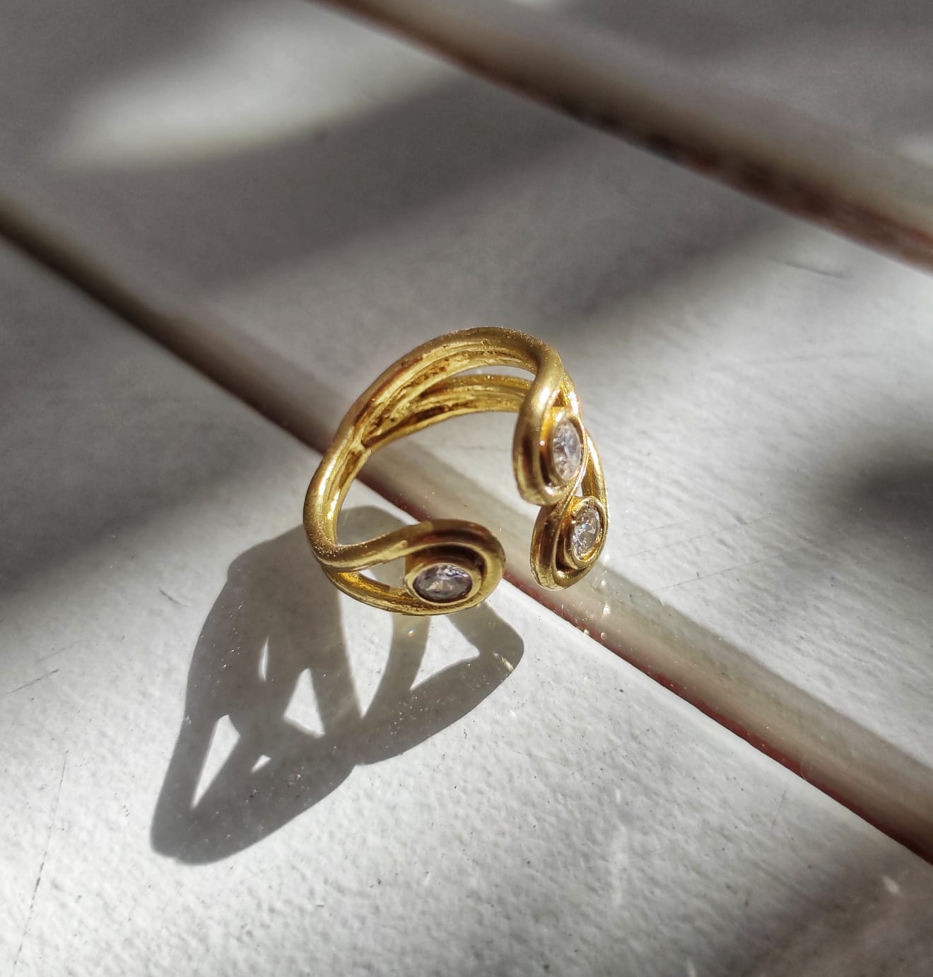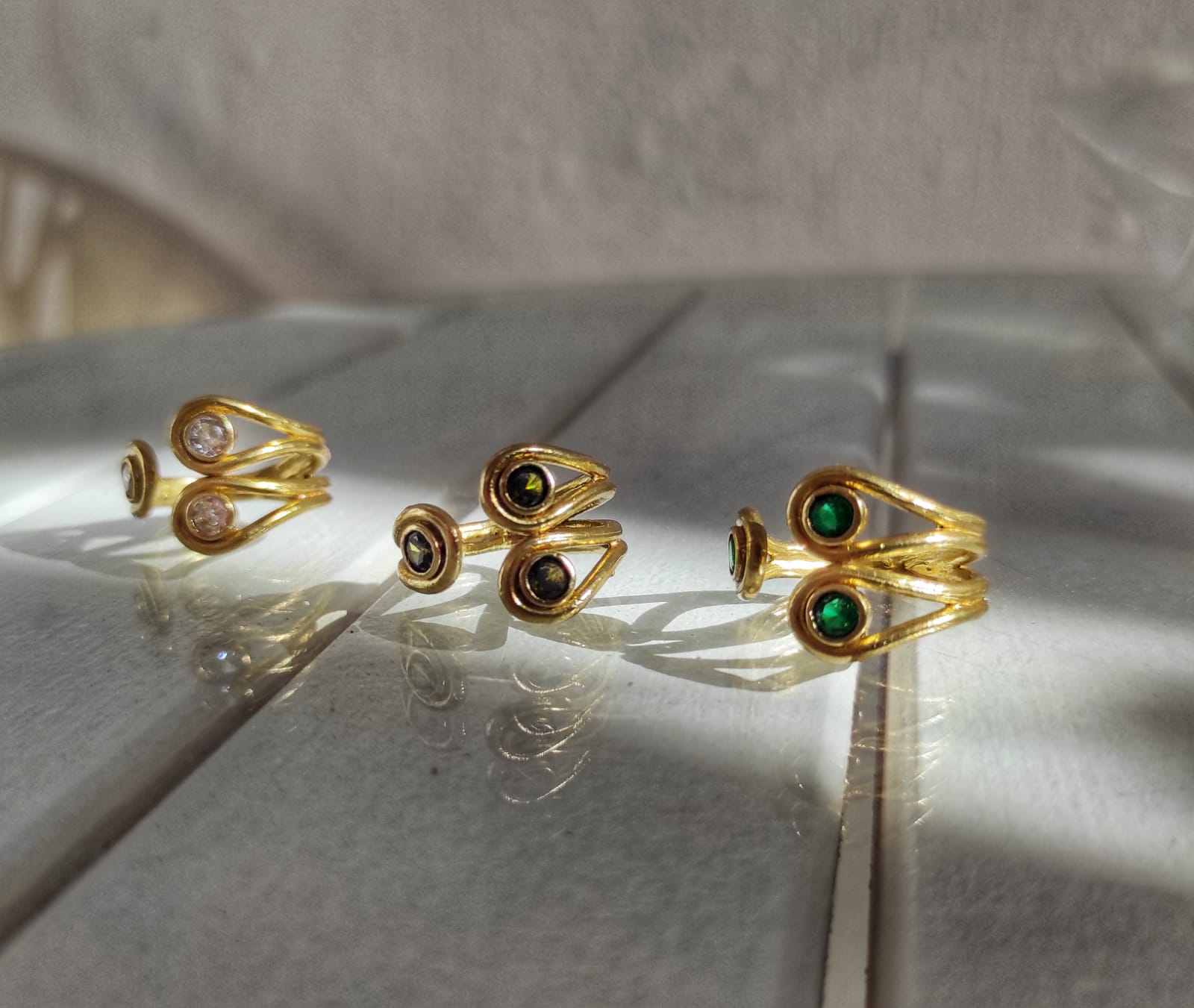 Pirinç ve Bronzun kendi renginde kullanıldığı, çok özel bir kaplama ile oksitlenmesini önlediğimiz ''VİNTAGE TYM'' koleksiyonumuzdan çok büyük ölçüler dışında her parmağa göre ayarlanabilir kollu 3 Taşlı Vintage havasında yüzüğümüz, Pırlanta taklidi yuvarlak faset kesim beyaz zirkon taş kullanıldı.