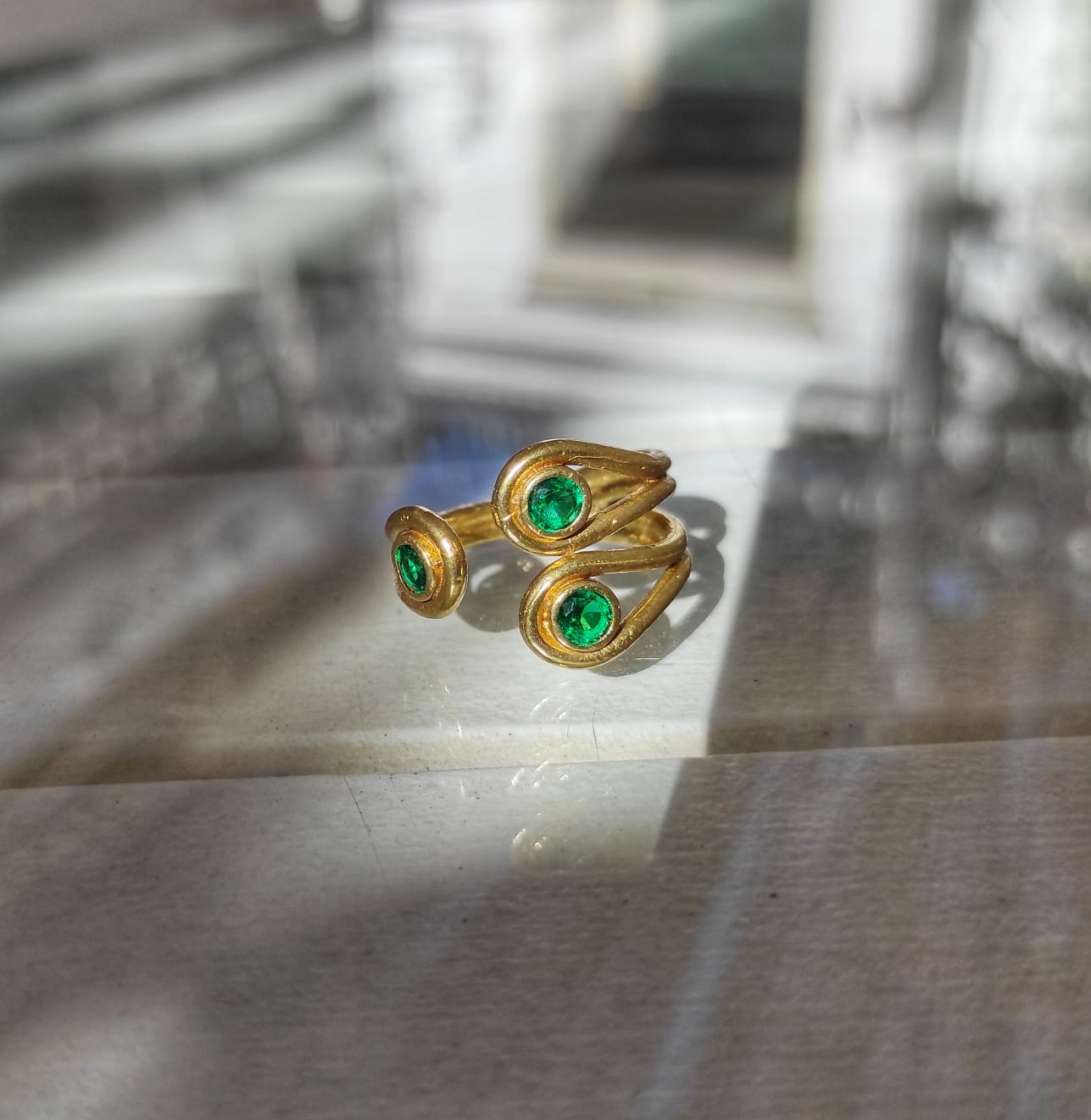 Pirinç ve Bronzun kendi renginde kullanıldığı, çok özel bir kaplama ile oksitlenmesini önlediğimiz ''VİNTAGE TYM'' koleksiyonumuzdan çok büyük ölçüler dışında her parmağa göre ayarlanabilir kollu 3 Taşlı Vintage havasında yüzüğümüz , zümrüt taklidi yuvarlak faset kesim yeşil zirkon taş kullanıldı.