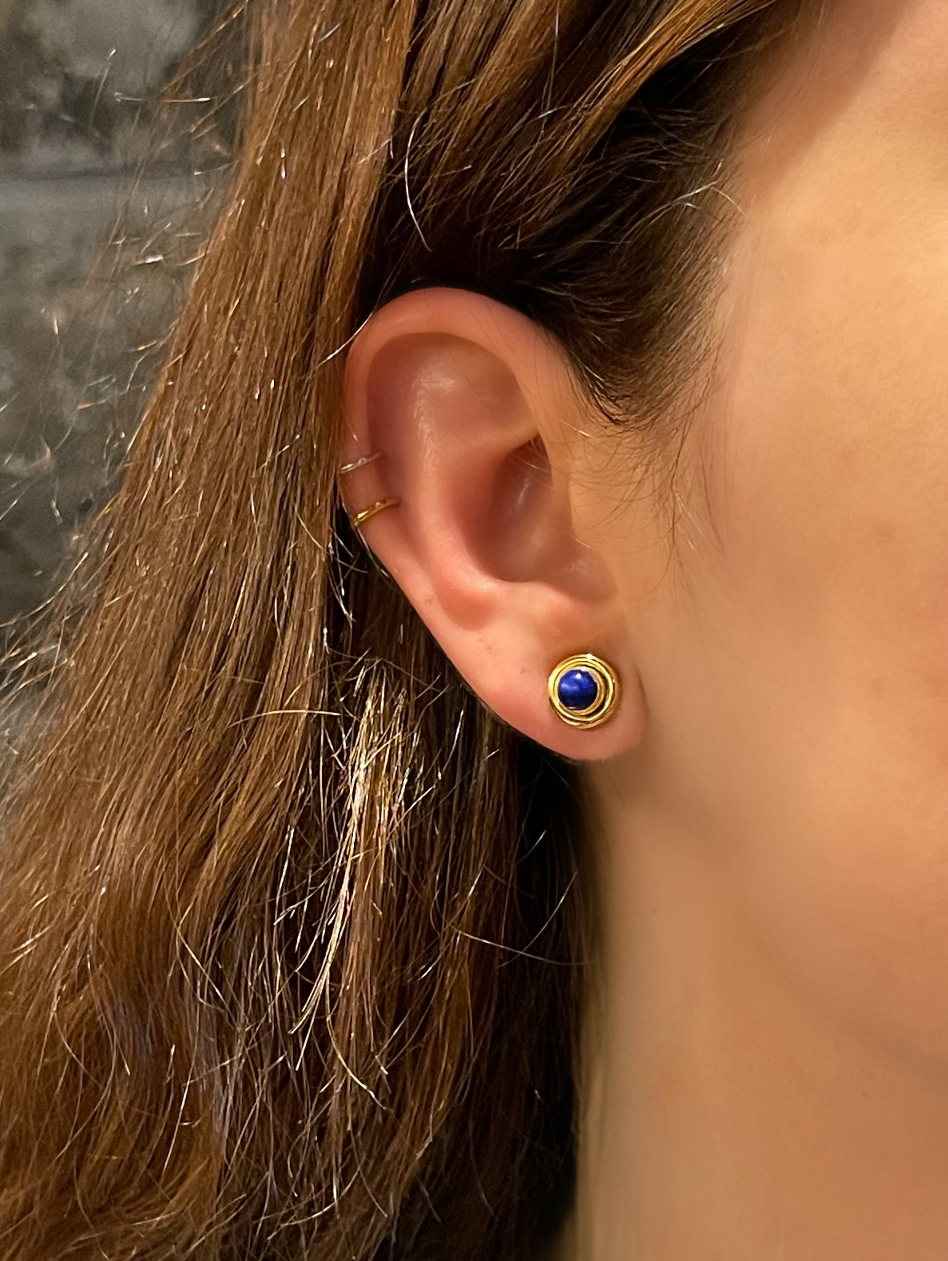 925 ayar Gümüş üzeri 0,50 mikron altın kaplama 5 mm yuvarlak kapşon kesimli DOĞAL Lapis Lazuli taşlı minimalist sadelikte çivi küpemiz, şık küpemizi kimyasallardan uzak tutarsanız uzun süre ilk günkü gibi kullanabilirsiniz. Mağazamızda satışa sunduğumuz küpemiz kendi Tasarımımız ve üretimimizdir. DOĞAL olarak belirttiğimiz taşlı takılarımızda kullanılan taşlarımız için GARANTİ vermek isteriz. Sentetik Zirkon grubu taşlar ürünlerimizde kullanılırsa bu ürün açıklamalarında belirtilir.