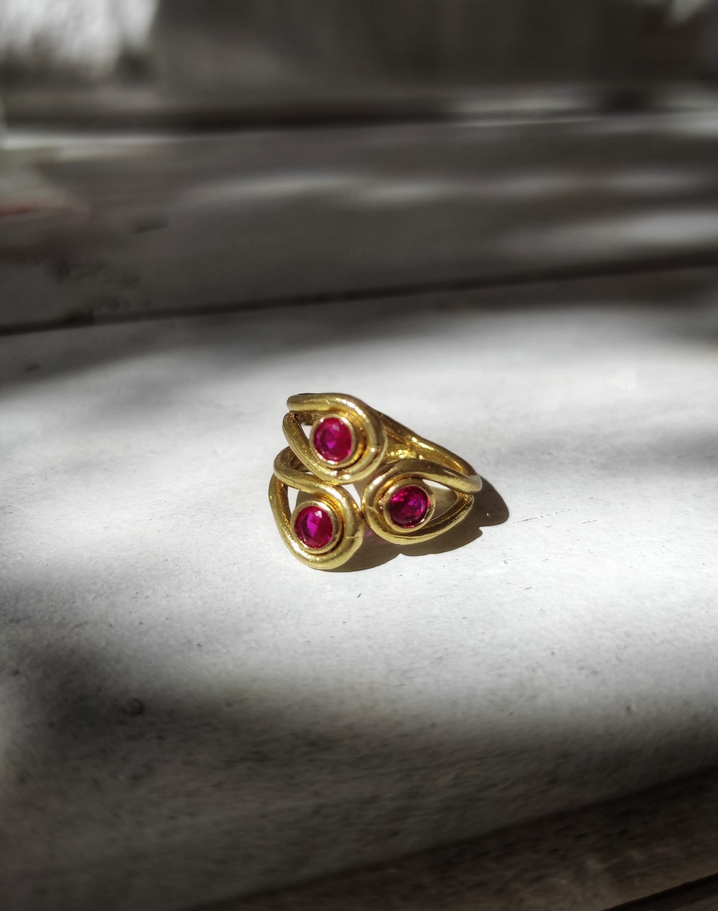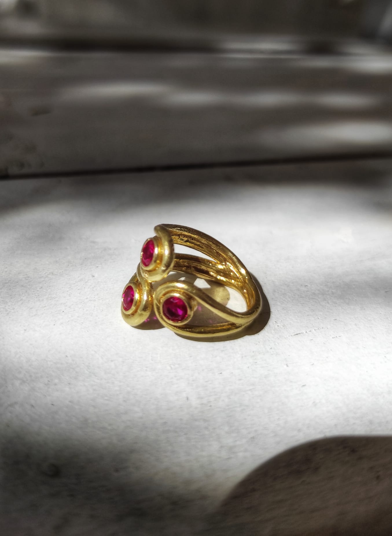 Pirinç ve Bronzun kendi renginde kullanıldığı, çok özel bir kaplama ile oksitlenmesini önlediğimiz ''VİNTAGE TYM'' koleksiyonumuzdan çok büyük ölçüler dışında her parmağa göre ayarlanabilir kollu 3 Taşlı Vintage havasında yüzüğümüz, Yakut taklidi yuvarlak faset kesim kırmızı zirkon taş kullanıldı.
