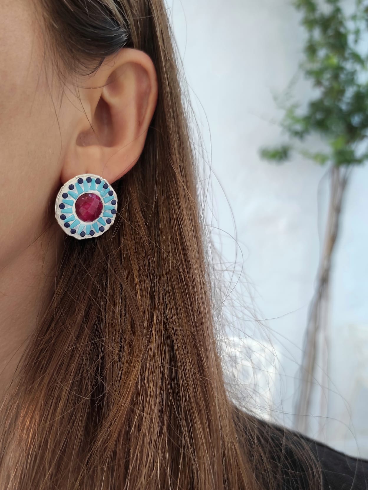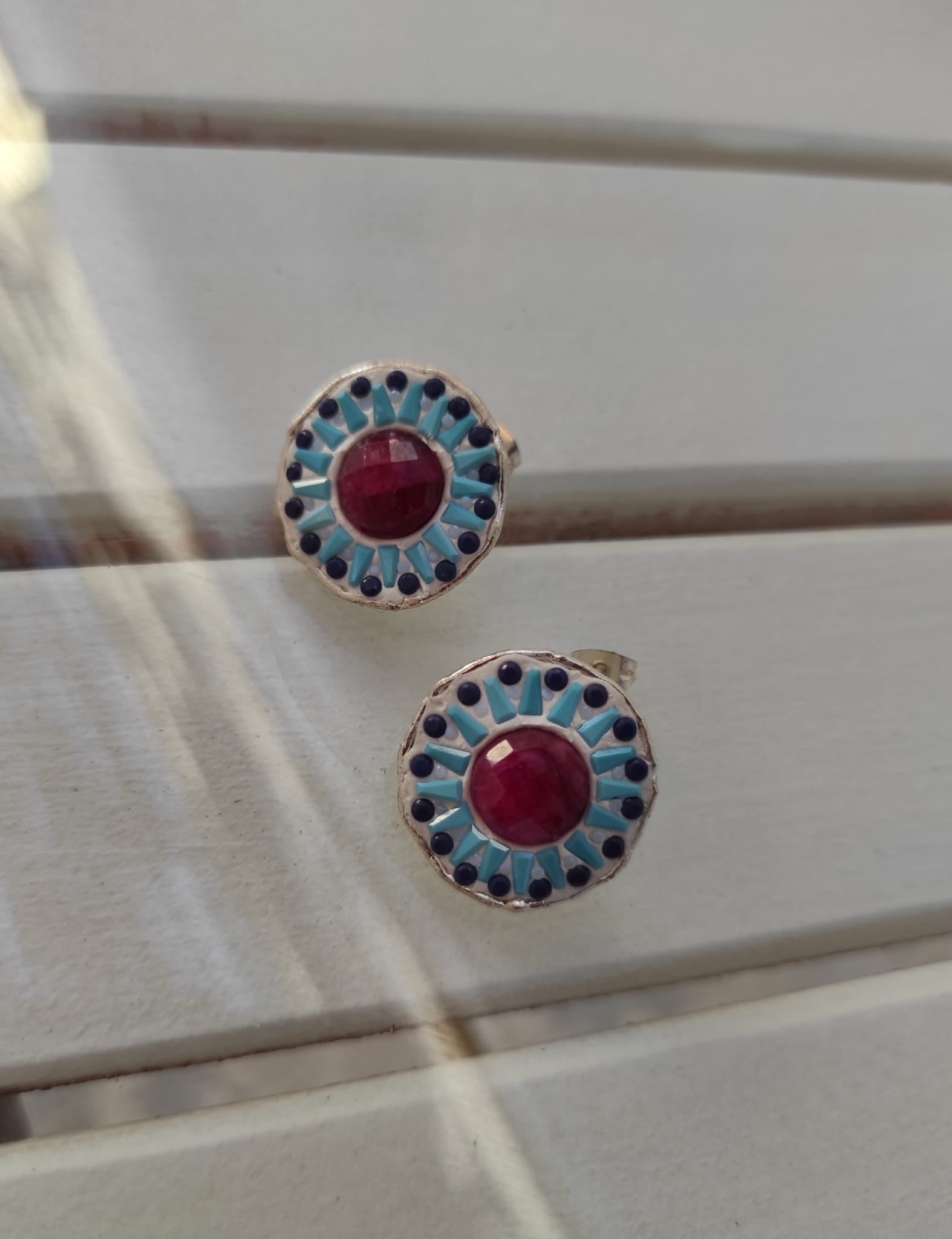 Beyaz mavi ve yakut kırmızısının hakim olduğu etnik ve modern çizgilerde otantik küpemiz, eski zamanlardan beri tibet ve türkmen takılarındada kullanılan reçine üzerine taş işlenen ‘’teknik’’ modern bir yorumla kullanılmış. Doğal taşlara kaliteli bir alternatif olan sentetik firuze, safir ve yakut taşlar ile üretilmiş. Bronz üzerine gümüş kaplama, ayrıca oksitlenmemesi için özel bir koruma ile kaplı. Kullanım tavsiyelerine uyarsanız uzun yıllar ilk günkü gibi kullanabilirsiniz.